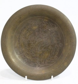 Lot Description:A Bronze Dish inlaid with Silver Wires, a Phoenix in the Centre with a Key Fret Border on the Curved Lip