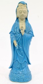 Lot Description:A Standing Figure of Guanyin, Wearing Blue Glazed Robes, an Impressed Mark to base