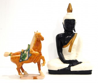 Lot Description:A Ceramic Thai Buddha, Black Glaze with White Robe & Gilt Trim & a Tang Dynasty Style Horse [2]