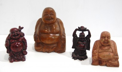 Lot Description:Four Very Happy & Laughing Buddha Figures, Carved Wood & Molded Composition