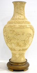 Lot Description:A Carved Lacquer Style Vase, with a Brass Base