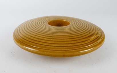 the wide form rim with fine concentric bands, tan glaze, printed mark to base. Diameter 210. -