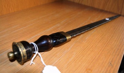 believed to be Scottish, hand forged steel blade, with multiple stamps Andrea de Ferrara, single sided steel blade with cross hatched back, turned & shaped timber handle with dome & cut engraved detail, brass fittings, good copy of a 16thC style sword, blade length 38cm, overall length 52cm -