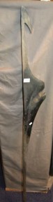 with hook point, elongated shaped blade with black lacquered finish, hand carved, note: has split through natural timber growth line, 160.5cm L -