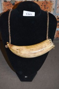 on natural woven neck cord, whale bone with fine patina, note: small chips to ends etc, tooth is 17cm L -