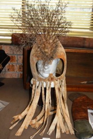 from late 19thC, copy of a late 18thC example, only one known, image of the original supplied, head of mask appears to be made from a gourd with dried plant comb decoration, natural compressed Coir tassles, life size example -