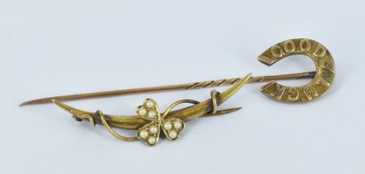 a tie pin featuring a horseshoe and a "clove" brooch set with seed pearls, all mounted in 15ct gold, total weight 5g -