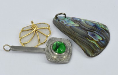 set with a green cabochon bead, together with two other pendant, including a Paua shell one. -