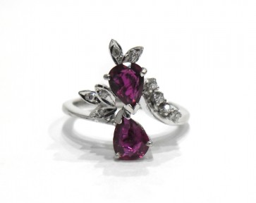 two pear shaped rubies, 0.60ct with nine single cut diamonds, 0.07ct mounted in a white gold ring