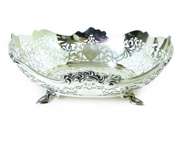 with foliate pierced walls, the serpentine rim with acanthus moulding, raised on four splay feet. Sheffield 1926 by Atkin Bros. 355gms. Width 210. -