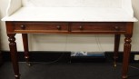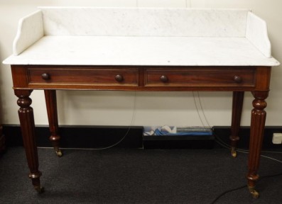 in Gillows style on reeded legs with brass castors with 2 mahogany lined drawers with knobs, 122cm wide, 56cm deep, 90cm high -