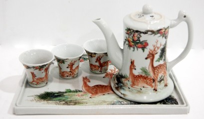 Lot Description:A Chinese Porcelain Wine Pot & Cups on Tray, signed Wan Yunyan