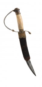 bone handle with brass fittings, steel blade and (partial) leather scabbard