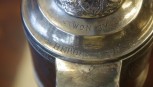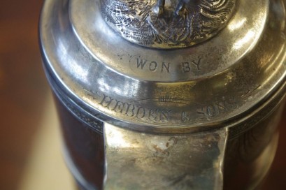 with presentation engraving to lid "WON BY HEBDEN & SONS" and to base "MURRUMBIDGEE PASTORAL ASSOCIATION ANNUAL SHOW 14TH SEPTR 1881" "SPECIAL PRIZE PRESENTED BY WM LEONARD ESQ. BINYAH STATION FOR THE BEST 3 MERINO EWES", pin from hinge missing, 28cm high, tested as sterling silver