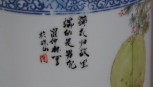 both with figures in a garden decoration, with script. Blue and white border to rim and base. Height 28.5cm approx (each). -