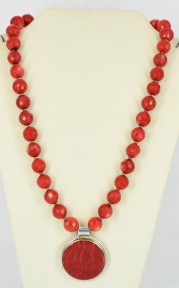 round facetted dyed coral beads with a round large pendant set in silver. Diameter beads 10mm approx. Length necklace closed 29cm. -