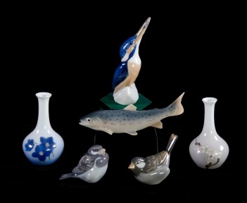 Incl. 2 Bing & Grondahl posy vases; kingfisher; 2 finch; & a salmon. -