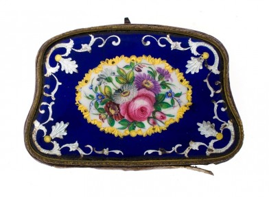 Cobalt ground with central floral bouquet & silk interior. Enamel with scratches & minor cracks.