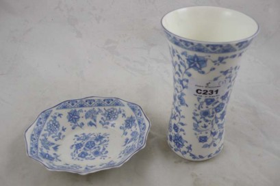 Lot Description:Minton 'Shalimar' blue and white vase and dish