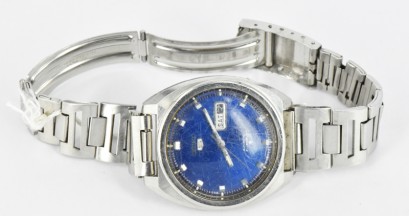 stainless steel, blue dial, date at 3 o'clock. Dial diameter 4cm. -