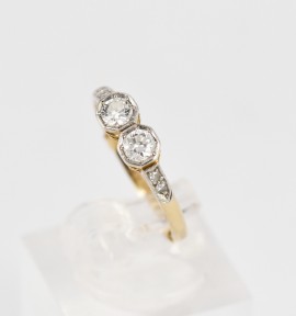 round brilliant cut diamonds of approx. 0.30ct in total with four tiny diamond on shoulders, all set in 18ct and platinum mount. Size L-M. Weight 2.5g. -