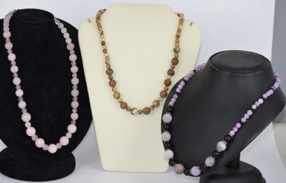 comprising one with graduated round rose quartz beads alternating with rock quartz, approx. 6-12mm on silvered clasp ; one with graduated round rhodonite beads, approx. 6-10mm on silvered clasp ; one with black and purple beads, on silvered clasp. (3) -