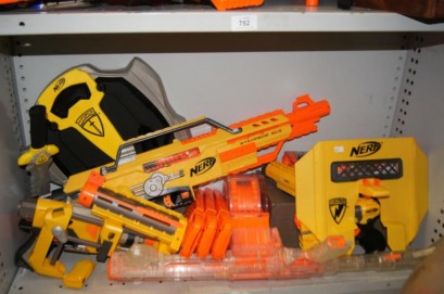 Lot Description:Shelf of Nerf toy guns, complete with darts