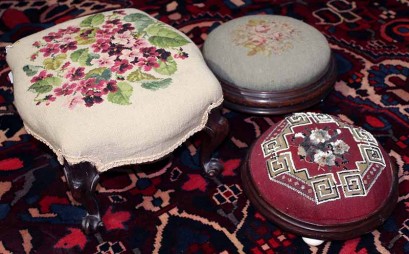 upholstered in tapestry and bead work, one with ceramic bun feet. -