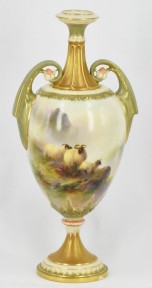 of ovoid form, the blush ivory ground ornamented with highland sheeps and lamb signed by Harry Davis, green scroll handles with flower head finish, heightened in gilt, raised on circular foot. Date code 1910, shape H248. Height 24.5cm. -