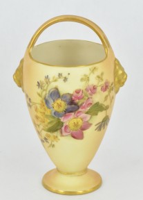 of ovoid form, the blush ivory ground ornamented with flowers, lion heads design below the handles, heightened in gilt, raised on circular foot. Date code 1910, shape 6/50. Height 12.5cm. -