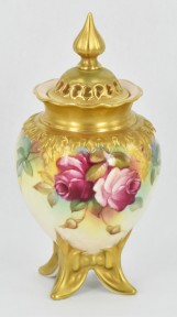 of ovoid form, the blush ivory ground ornamented with roses, openwork lid, scallopped rim, heightened in gilt, raised on four feet. Signed Mildred Hunt. Date code 1950, shape H277. Height 13.5cm. -