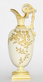 of ovoid form, the blush ivory ground ornamented with gilded flowers, one scroll handle, heightened in gilt, raised on square foot. Date code 1869, shape G627, RN. 220105. Height 26.5cm. -
