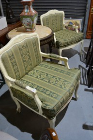 carved ivory painted timber frame with green and gold upholstery and matching removable cushion -