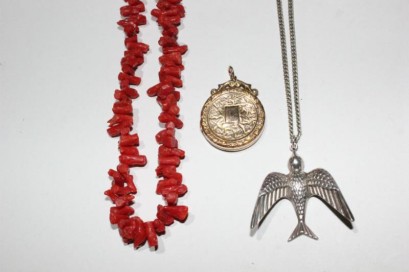 silverplated dove in flight pendant on a plated chain and an antique front and back locket -
