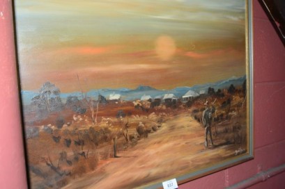 Lot Description:John John - oil painting of swagman in an outback homestead