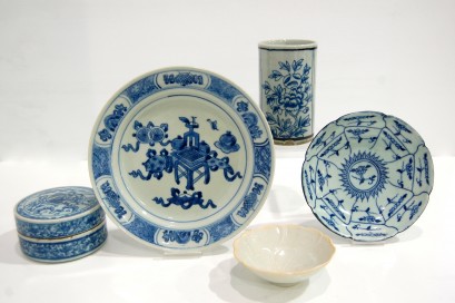 Lot Description:Underglaze Blue Porcelain Dishes, Brush Pot & Lidded Paste Box, with a Song Style Shallow Bowl, late Qing & early 20th Century