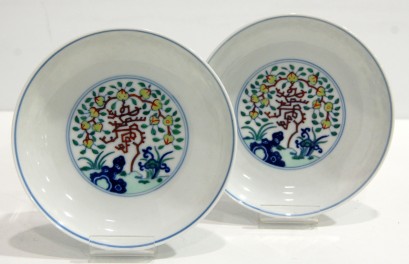 Lot Description:A Pair of Shallow Porcelain Dishes, Painted with Peaches in Overglaze, Qianlong Seal Mark