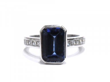 one emerald cut tanzanite, 2.30ct with fourteen princess cut diamonds, 0.45ct mounted in a white gold ring