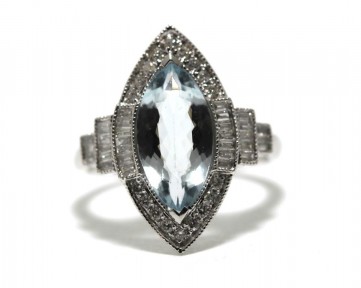 one marquise aquamarine, 2.30ct with eighteen round diamonds, 0.36ct & twenty six baguette diamonds, 0.50ct mounted in a white gold ring