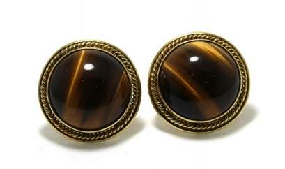 two round tiger's eye stones, 18mm mounted in yellow gold twist frames