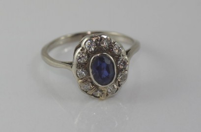 centre lighter blue sapphire surrounded by diamonds, weight: approx 3.3 grams, size: O-P/ 8 -