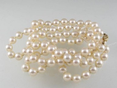90 Japanese Akoya pearls with a 14k gold clasp; 7.4 - 7.8mm pearls. -