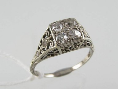 old-cut diamonds bead set in a square group and with four shoulder diamonds; 18ct white gold filigree gallery and shoulders. Estimated weight of diamonds 4 = 0.40ct. Wt 2.7g. -
