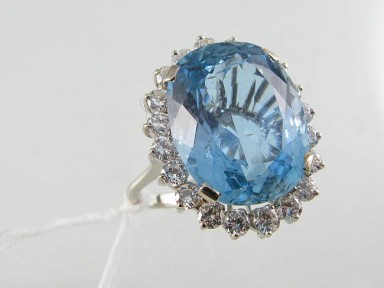 claw-set in 18ct white gold. Estimated weights: Aquamarine = 10.0ct, Diamonds 20 = 1.10ct. -