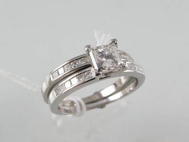 with a large princess-cut diamonds and 26 small princess-cut diamonds channel-set in 18ct white gold. Estimated weight of diamonds 1 = 0.97ct, 26 = 0.53ct; centre diamond graded in the setting as Colour E, Clarity P1, 26 = 0.53ct. -