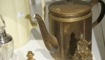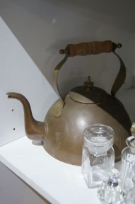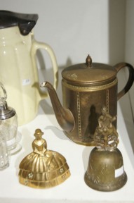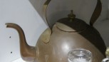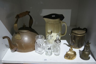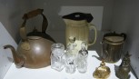 bottles with stoppers, 2 brass owls plus a copper lidded teapot with handle, metal coffee pot and a vintage electric teapot - no plug -