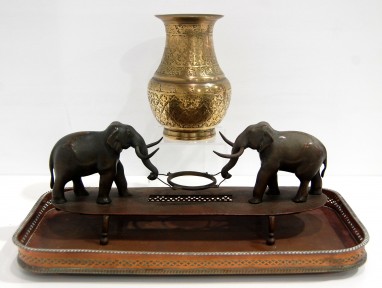 Lot Description:A Copper Tray with Pierced Edge, & Indian Elephant Sculpture on a Raised Platform, + a Brass Vase