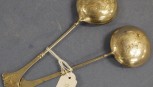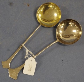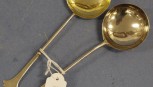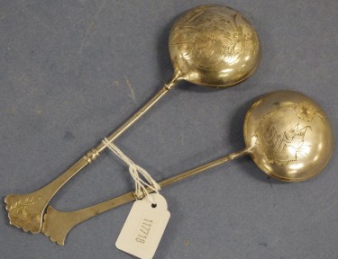 near pair, each marked '84' , with engraving to bowls verso, 1 with engraved dedication to handle finial. Length 17cm approx (longer spoon). -