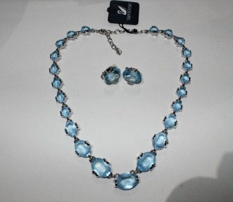 to incl. a blue topaz coloured graduating necklace set with multiple oval blue coloured crystals along with matching earrings on a clip on backing -