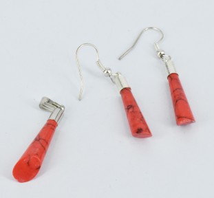 comprising a pendant and a pair of earrings, coral coloured howlite. -